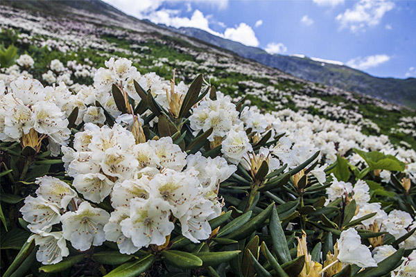 Les flors no difereixen de grans dimensions, no superen els 3 cm de diàmetre. Es localitzen amb inflorescències umbel·lades, en les quals es recullen de 9 a 10 corol·les. El seu color pot ser tant de color blanc de neu (com es pot trobar principalment als vessants del Caucas Occidental), com de color pàl·lid o de color rosa clar (el seu lloc de creixement és el Mont Gamzachiman a Armènia del Nord, la Serralada de Trialeti i la regió d'Elbrus, Mount Cheget). Però es produeix, però, molt menys sovint, i rododendro amb flors grogues.