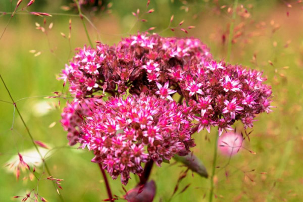 - Rosa Stonecrop es diferencia d'altres espècies, ja que pot créixer fins a 80 cm de longitud. Té flors petites de color rosa. La planta s’utilitza per aturar el sagnat, difondre els processos inflamatoris, eliminar els tumors, com a mitjà de curació i augmentar el treball de les defenses del cos.