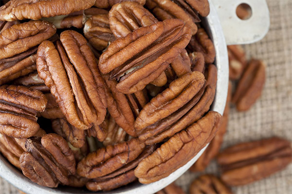 Un altre avantatge de la composició dels pecans és l’absència de colesterol i la capacitat de combatre un augment del seu nivell a la sang, a causa del qual es netegen els vasos. 100 g de producte representen més del 70% de greixos saludables, 9 g de proteïnes i 14 g d’hidrats de carboni.
