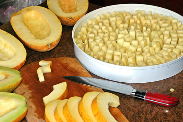 Per a les preparacions per a ús futur, només es seleccionen fruites que no resultin danyades en res. La mida és millor prendre mitja.Hi ha moltes varietats de melons, que es diferencien no només per la forma, sinó també pel contingut. Alguns melons són massa sucosos i gairebé no són adequats per assecar-se. És millor triar una varietat de sucositat mitjana de manera que el temps d’assecat no trigui massa. Al cap i a la fi, se sap que el meló és un 90% d’aigua. I a l’hora d’assecar el producte, cal evaporar tota la humitat de les rodanxes. El procés habitual no triga més de dotze hores i és necessari que no es quedi ni un sol gram d’aigua en trossos de meló.