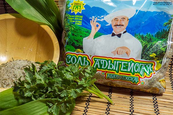 Unlike cooking salt, Adygean salt is impregnated with smells, flavors of vegetable additives, together with them vitaminized, acquires more useful characteristics. The popular seasoning is bought in supermarkets or made themselves at home.