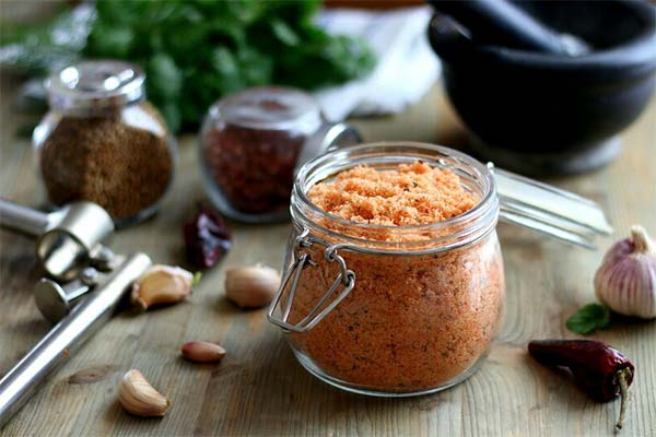 Grind the last component in any convenient way. Separately in a bowl mix salt with spices, pepper, coriander seeds. Add the garlic. The moist consistency of the resulting product does not require drying. It is transferred to a suitable container, hermetically sealed.