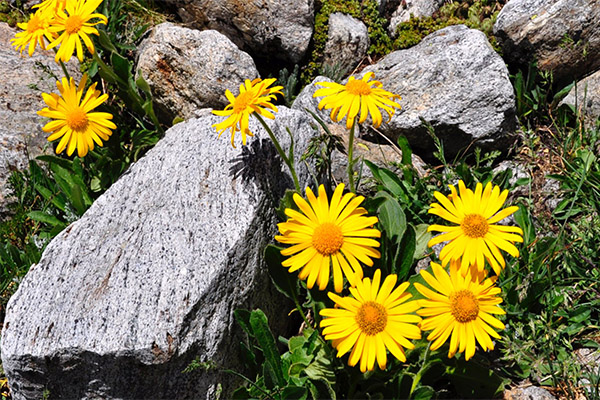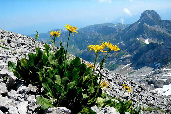 Alpine arnica grows up to 30 cm in height and can be found not only in European mountains, but also in North America. Its range slightly covers the Arkhangelsk and Murmansk regions, it feels fine on the Kola Peninsula, in its rather harsh cliffs, and even in the tundra. In contrast to its other relatives, it is tolerant of dry soil and settles on mountain slopes rich in calcium, among sparse shrubs, and also on bare gypsum rocks overgrown with mosses. Near the foothills, in meadows, it is more difficult to find.