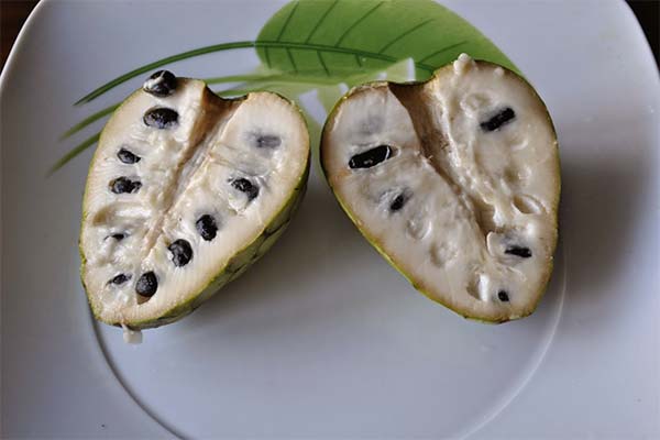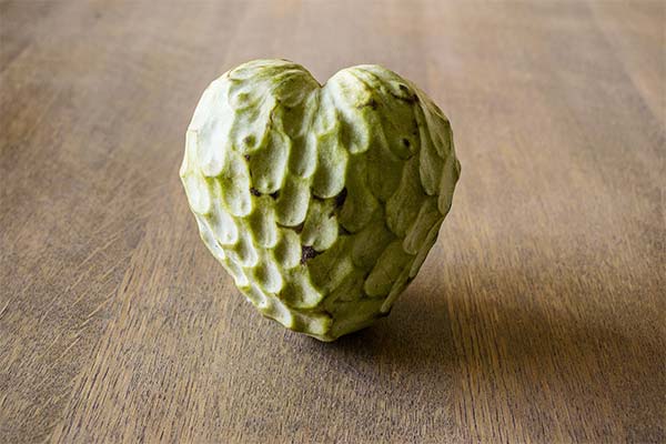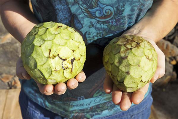 The fruit of the cream apple looks like a heart or cone. The size ranges from 10 to 20 centimeters wide. Inside the fruit is white, fragrant flesh and seeds. A single fruit can weigh up to three kilograms.