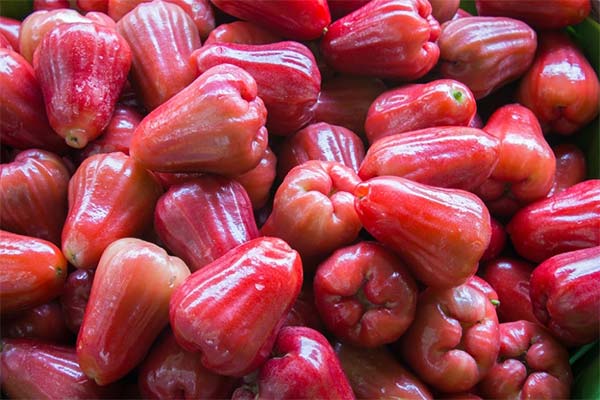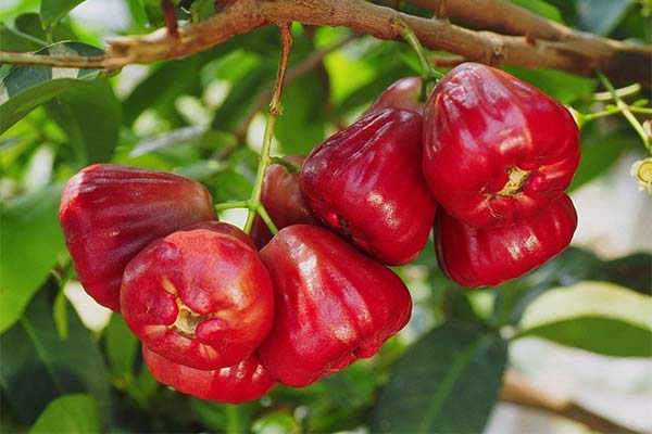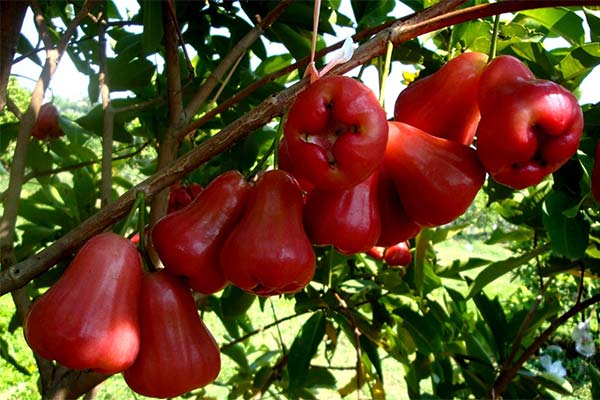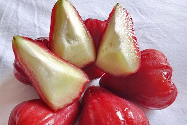 The rose tree bears fruit mainly from mid-spring to mid-summer. But in Thailand, the fruit ripens twice a year: in winter and spring. The fruits, which grow in clusters, are shiny and resemble bell peppers or pears. Their color can vary from pale green to burgundy. By the way, they can also differ in appearance, so, the light fruits are more rounded and small, while the red and maroon fruits look more like a bell. They do not have a definite taste and smell, but resemble a slightly sweet pink water. The flesh can range in color from white to light yellow. And the whiter the flesh, the more pronounced the flavor will be, and the chompu will not be sour.