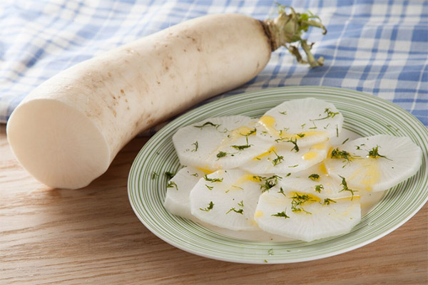Daikon can also be used as a decoration for the table. Despite the fact that daikon is used in different forms, the greatest benefit can be obtained precisely from the raw product. For example, a great snack will come out of the root vegetable chopped on a coarse grater with the addition of lemon juice and herbs.
