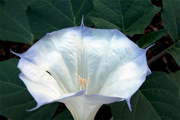 A distinctive feature of the datura grass is its fragrance. Not only the flowers, but also the leaves have quite a strong smell. Datura has large, dark green leaves. There are denticles and notches around the edges.
