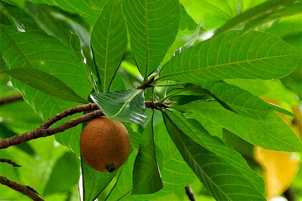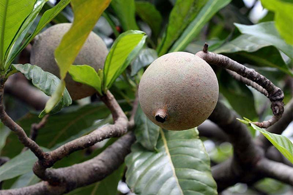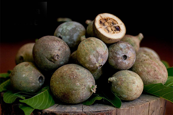 Fruits are oval in shape, 9-15 cm long and up to 9 cm wide. The skin is rough, as if lightly dusted with flour. Inside the fruit are light brown or yellow seeds. Interestingly, the inside pulp is cream-colored to begin with, but once in contact with air, it gradually turns yellow. And this is not all the unique qualities of the foreign fruit.