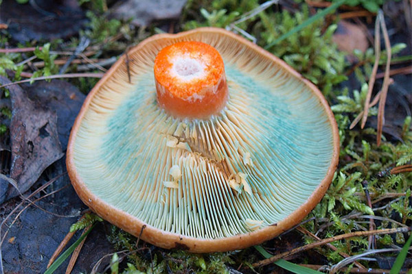 - Finnish. It has a cap 3-8 cm in diameter, with a very sticky surface. The coloration is slightly different, it is darker in the center compared to the edges. The plates are small, very narrow, and very green. The milky sap turns green on contact with air. When pressed, the color changes to blue. It grows mainly in Karelia or Volgograd region.