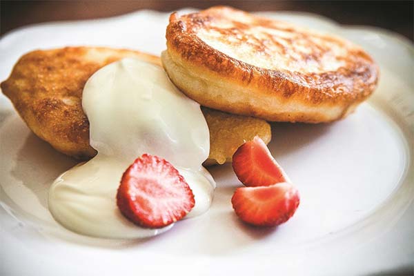 At first you make a stew of milk, yeast, sugar and half the flour. It should be kneaded and put in a warm place, when it rises, stir once more, add the rest of the ingredients and again leave in the heat to rise again. Fry on a hot frying pan with a little vegetable oil on medium heat. Serve hot with sour cream, jam and other additions to taste.