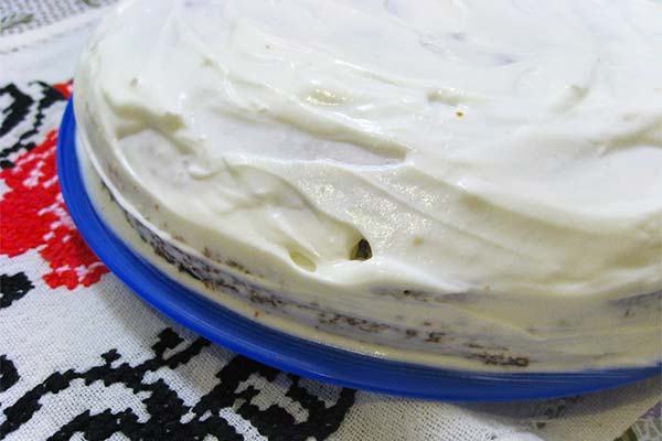This component is introduced at the beginning of cooking. In a bowl with high walls, combine two tablespoons of powdered sugar with 100g of soft butter (spreads are not suitable), beat to a crisp. In the same place they add 0.5 kg of sour cream and the rest of chopped sugar. We beat this mixture with a mixer for 5-10 minutes.