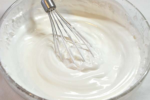 To obtain the desired consistency, place the sour cream in the refrigerator for 3 to 4 hours before whipping, or remove excess whey. For this purpose, a sieve with gauze folded several times is placed in a bowl or saucepan. Pour the fermented milk product on the cloth, close with a lid, send to the cold for 8-12 hours. During this time, the excess whey drains, increasing the density of the sour cream product.