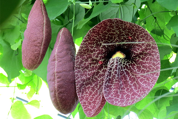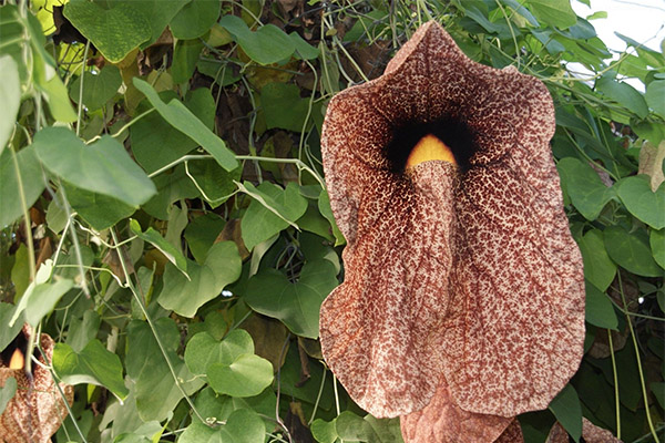 - Large-leafed Aristolochia. In appearance, a typical large liana with smooth bark of a marsh-green color. With age, the bark cracks and turns a light brown color. The green leaves are heart-shaped and up to 30 cm in diameter. A characteristic feature is the mosaic coloring due to the fact that the leaves on one shoot differ in shade. Leaf fall occurs in the fall period. Flowering time is early summer. The seed pods have an oblong appearance.