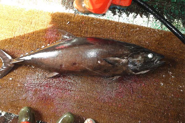 Is a very large individual, capable of growing to two meters in length and weighing up to 25-35 kg. The basic color is dark brown. In old age it may change to dark black. Due to the side fins can easily be confused with ordinary tuna.