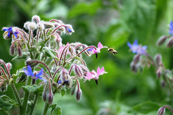 - Flowering period. Borago has a long flowering period - from June to August. At this time each flower accumulates 5-12 mg of sweet nectar, which attracts bees. Therefore, the borage is among the best honeybee plants.
