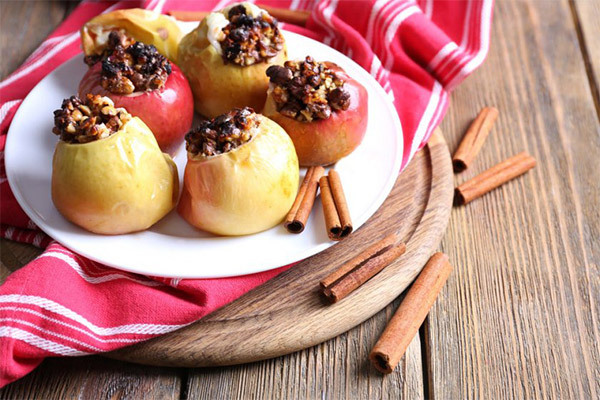 - A classic recipe for baked apples is with nuts and honey. To prepare such a dish, you need to choose high-quality fruits, wash them, remove the core, stuff apples with a mixture of honey and nuts, sprinkle the top with cinnamon and sugar. Then place the pieces on a baking tray and bake at 180 degrees for 30-40 minutes.