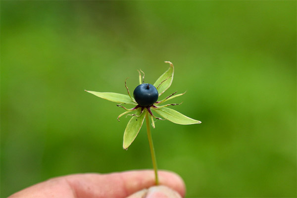 From the center of this peculiar cross of leaves rises a short and not very thick peduncle on which there is an inconspicuous greenish flower consisting of two rows of narrow, very petal-like sepals. The outer row is green, about 4 cm long, while the inner row is smaller, yellow-green. On the whole, the flower resembles the shape of a star with pointed rays. It flowers from late May and early June until the first days of August and then forms a large, shiny berry, which is why the crow's eye gets its name. The berry is red at first, but turns a dense black color with a grayish-gray patina as it ripens.
