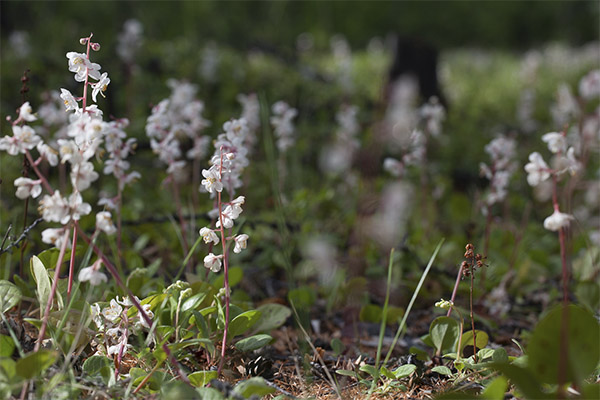 - Grushanka er rundbladet. Planten er preget av et forgrenet rotsystem med rette ribber skudd, hvis lengde er 30 cm. Bladene er mettede grønne i fargen, med en diameter på 6 cm. Det er også en petiole med lengden 12 cm. Blomstene er malt hvite. Det brukes både innen tradisjonell medisin og homeopati.